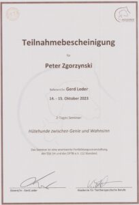 Die Prüfung, die mich zur selbstständigen Ausbildung im Bereich Hund-Mensch berechtigt, habe ich vor dem Veterinäramt Dietzenbach abgelegt.